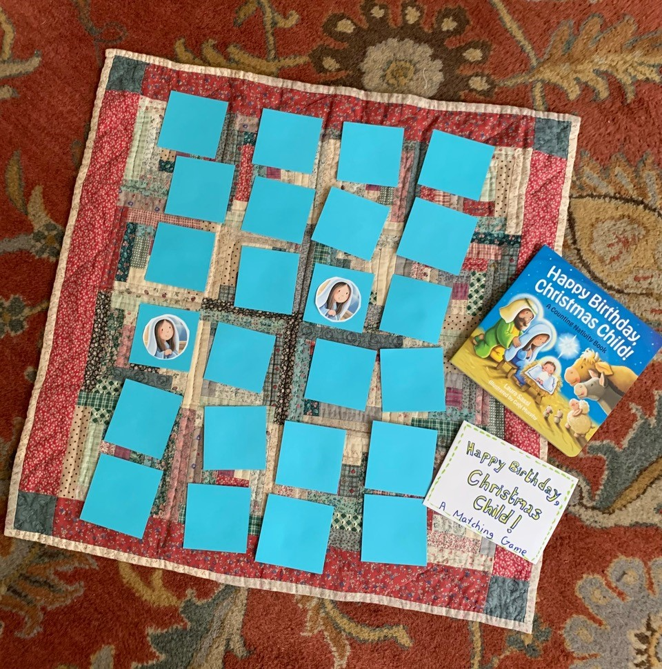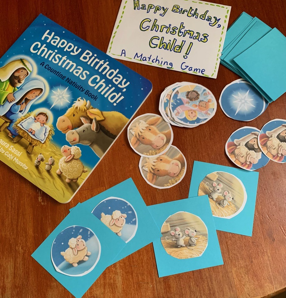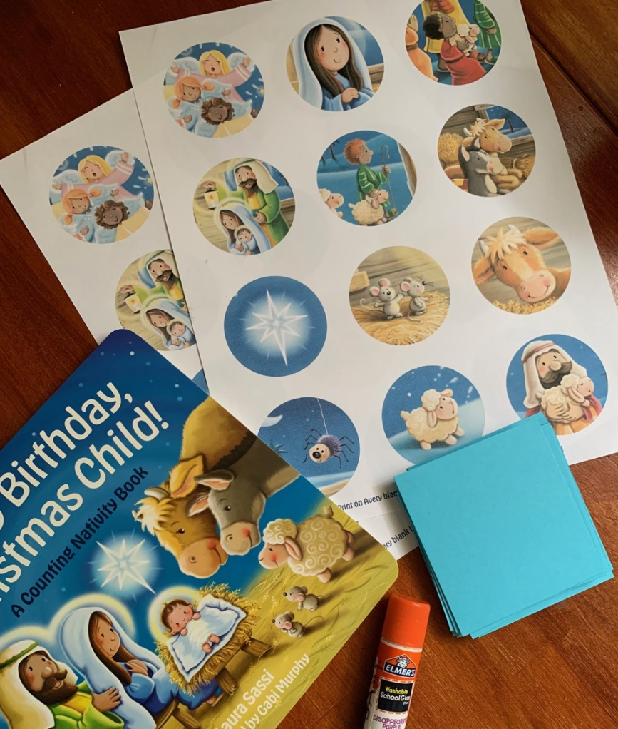 After enjoying the book, little ones might be ready for this book-themed matching game from the free downloadable “Happy Birthday, Christmas Child” activity kit. The sticker templates for the game are found on page six. NOTE: You might also enjoy the other resources there, including cupcake toppers, coloring pages, number sheets and a complete party plan!