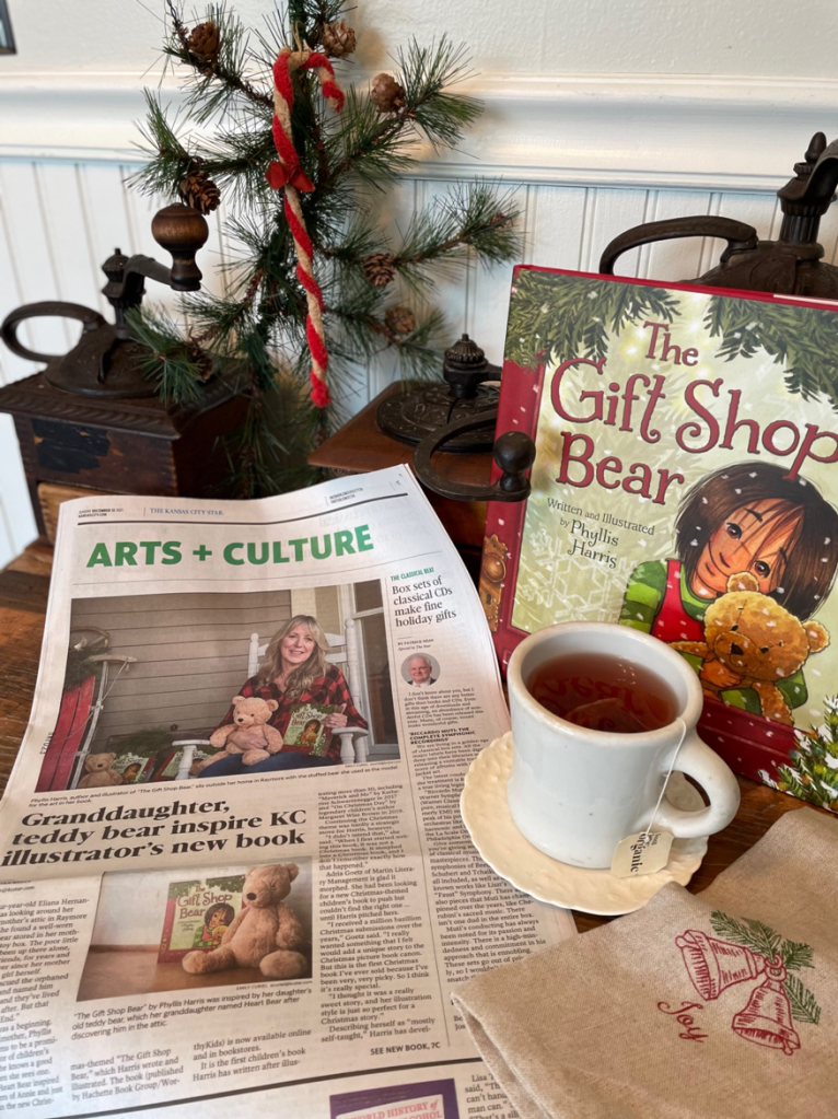 Thanksgiving is behind us and the holidays are coming which is just perfect for today’s debut picture book, THE GIFT SHOP BEAR, and debut author/illustrator Phyllis Harris, who has graciously come by to share her journey to publication with us (including a glimpse of her lovely work space which will have you all goggle-eyed with envy 😊)