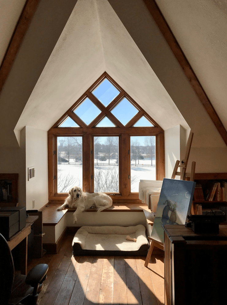 Phyllis’s gorgeous work space and her work buddy, Brinkley. (Named after the dog in her favorite movie, YOU’VE GOT MAIL. 😊